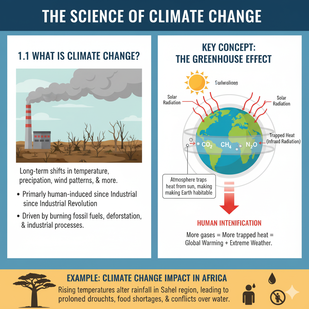 Climate change refers to long-term shifts in temperature, precipitation, wind patterns, and other aspects of the Earth’s climate system. While natural factors (such as volcanic eruptions and solar variations) influence climate patterns, the rapid changes observed since the Industrial Revolution are primarily human-induced, driven by the burning of fossil fuels, deforestation, and industrial processes.