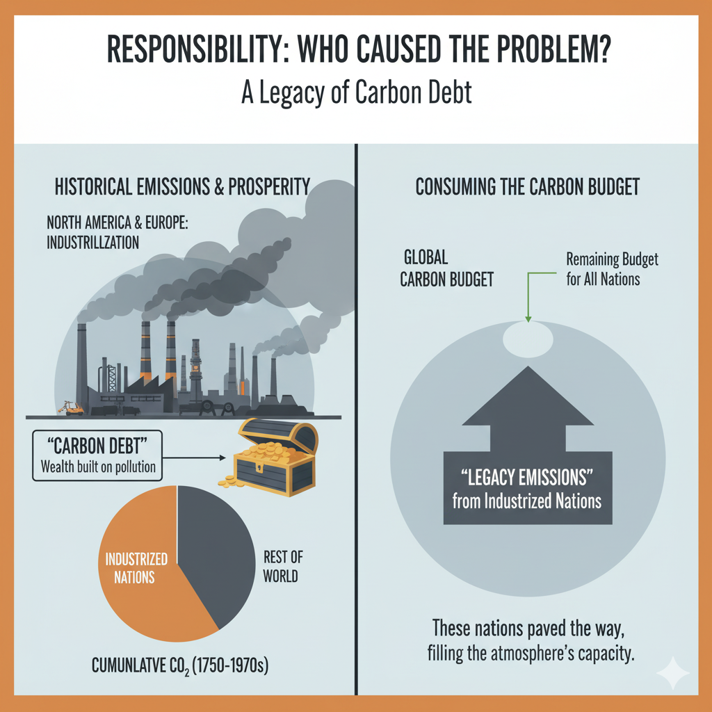 “Legacy Emissions”: The CO₂currently causing climate change often remains in the atmosphere for centuries. The high cumulative emissions of historically industrialised regions mean that the prosperity of these nations was built upon the unpriced externality of carbon pollution. This is often framed as their “carbon debt.”