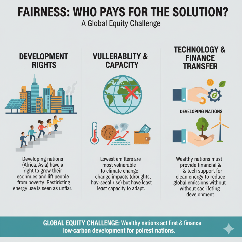 Technology and Finance Transfer: A cornerstone of the fairness argument is that historically responsible, wealthy nations should provide substantial financial and technological support to developing countries. This aid would allow developing nations to leapfrog the fossil-fuel-intensive stage of development and adopt clean energy solutions, thereby reducing future global emissions without sacrificing development goals.