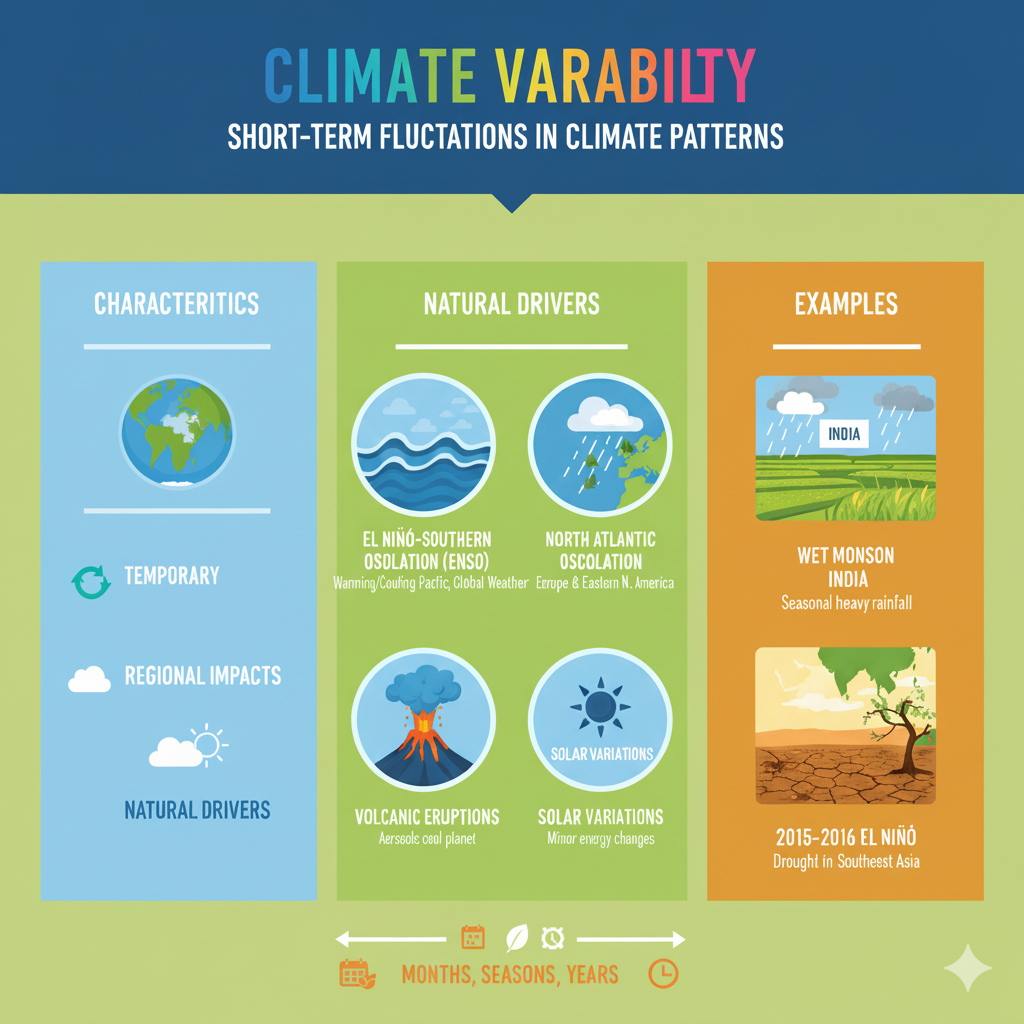 Climate variability refers to short-term fluctuations in climate patterns. These are natural deviations from the average climate conditions that occur over months, seasons, or a few years. They are driven by natural internal processes within the Earth’s climate system, such as ocean currents and atmospheric circulation.