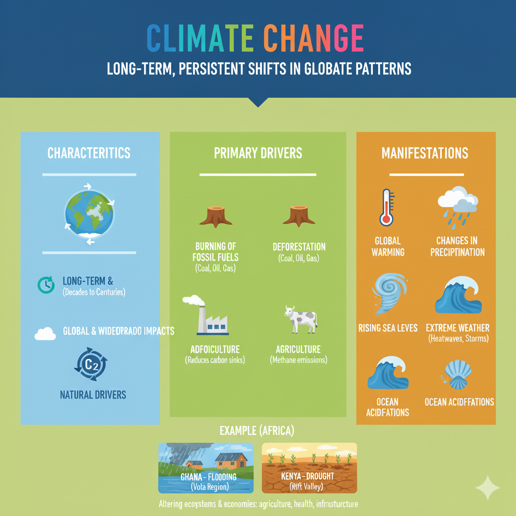 Example (Africa): The persistent and increasingly severe flooding in Ghana’s Volta region or the more frequent and prolonged droughts in Kenya’s Rift Valley are no longer seen as isolated incidents of variability. Instead, they are becoming part of a changing climate pattern. This shift is fundamentally altering ecosystems and economies, affecting critical sectors like agriculture (crop failures, livestock loss), health (waterborne diseases, malnutrition), and infrastructure (damaged roads, homes). These are not just bad years; they represent a fundamental alteration of the region’s climatic baseline.